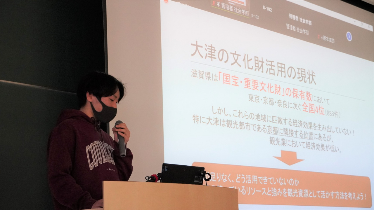 その中でプロジェクトの受講生たちは「京都とは違った、大津ならではのゆったりとした空間を活かしながら、少数の観光客から多くのマネーを創出することが大津には必要である。大津に求められる観光客は量より質であると言える」という結論にたどり着き、今後は琵琶湖をはじめとした自然を活かし、文化財と関連付けることで大津でしか味わえない価値を生み出すことが必要だと考えています。今後は、今までの経験を活かして実習に取り組んでいきます。
