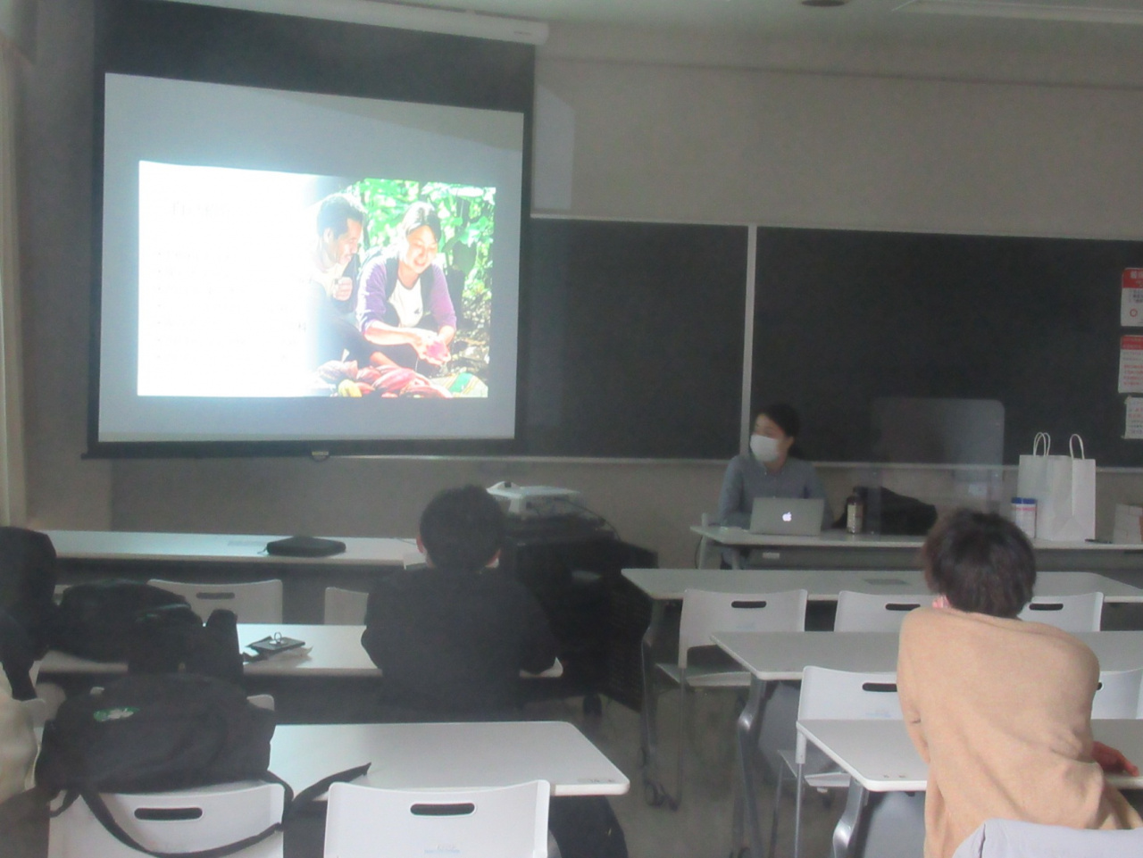 講演の中で、足立氏は、現地で農家のホームステイをしながら農家の指導や収穫・調整に関わるだけでなく、梱包・発送し、開梱・加工、そして消費者への販売に至るまでのダイナミックな仕事の様子をスライドを用いて説明されました。大手企業が安価に利用しているインドネシア産のカカオ豆に付加価値をつけて、現地の生産者の所得を増やすグローバルな社会的企業の側面と、学生にとっても理解しやすいバレンタイン商戦における大手コンビニとのコラボレーションなどの小売業の実態の側面を自身の仕事内容を通じて具体的に紹介されました。