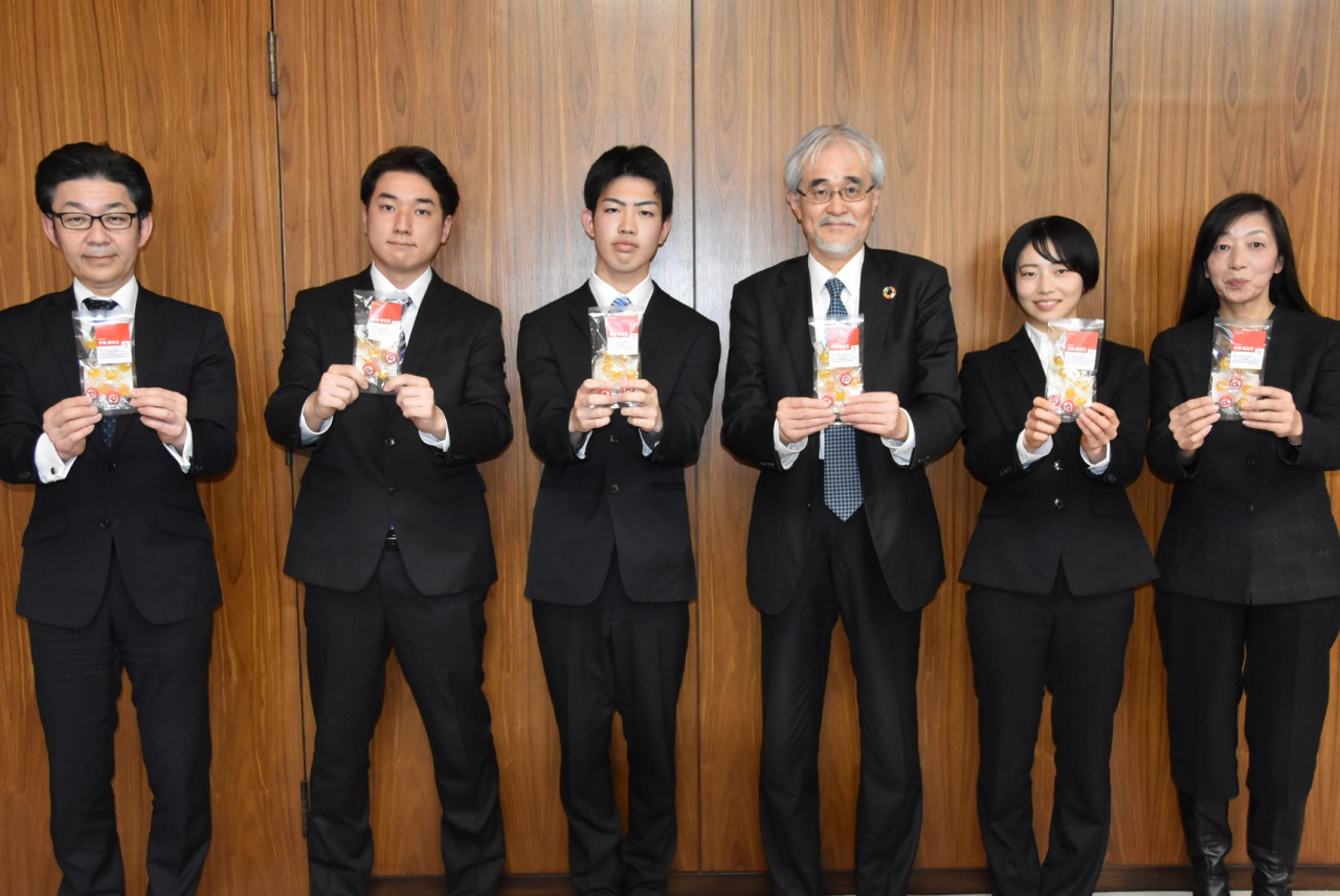 龍谷大学スポーツサイエンスコース(経営・経済・政策・法学部) 松永敬子ゼミ(以下、松永ゼミ)では、今西製菓株式会社様協力のもと商品開発、生産している京飴「龍谷玉」を学校法人龍谷大学教育研究等振興資金(以下、ご寄付)寄付返礼品として、大学に採用されたことを受け、2022年1月26日(水)に学長・総務局長への報告を行いました。