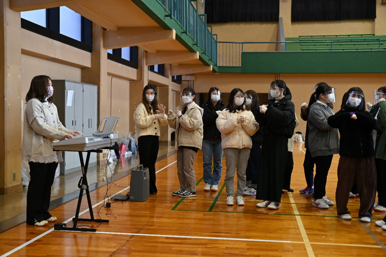 2021年12月15日(水)1講時、現役保育者として活躍する卒業生3名の先輩による保育実技指導がありました。幼稚園・保育所での実習に初めて臨む1年生にとって、先輩から保育現場の実情をうかがい、子どもの発達や保育の実態に即した保育実技のありかたを学ぶよい機会となりました。