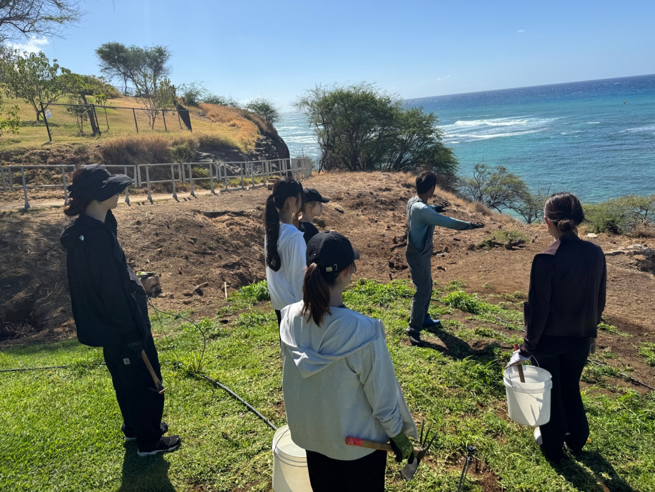 龍谷大学の留学プログラム「RISE Program in Hawaii」に参加中の学生11名は、8月23日、ホノルルにある自然保護団体「Kuilei Cliffs Restoration Project」が行う環境保全活動に参加しました。