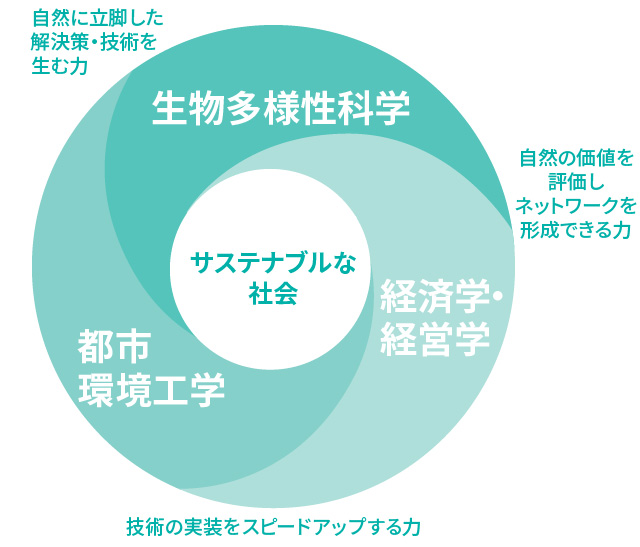 建学の精神に基づいて、サステナビリティをめぐる幅広い知識を身につけるとともに、都市環境工学、生物多様性科学及び経済・経営学に係る専門知、並びにそれらを統合した視点を獲得し、持続可能な社会の創造に向けて、実践的に課題解決に向き合える環境人材を育成することを目的とする。