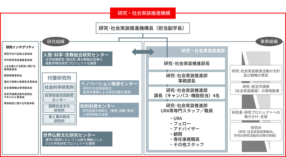 本機構は、学際的研究を推進する人間・科学・宗教総合研究センター、世界仏教文化研究センター、多様な附置研究所に加え、知的財産マネジメントや産官学連携、研究プロジェクト支援を担う知的財産センター、イノベーション推進センターを統合し、有機的な連携を進めていきます。これにより、研究者が自由度の高い挑戦的研究を進める環境と、その成果を社会へ届けるまでの道筋が、これまで以上に盤石なものとなります。